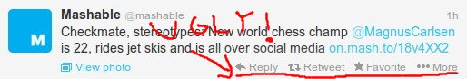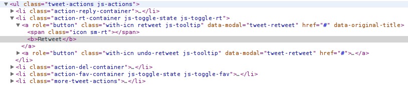 So we have a list <ul></ul> with items <li> one for each of Reply, Retweet, Favorite and More. Inside every of them they have a <a>(anchor that processes the click action), deeper we have a <span> that becomes the icon, and finally followed by the ugly text wrapped in <b>. That looks easy enough, we will find all these elements based on their  class attribute, descend down to find the text and get rid of it.  So we create a new folder for TwitterClean extension, copy paste some manifest boring code and set it up to load a javascript file anytime twitter loads. For example, right after twitter.com page loads, lets execute: