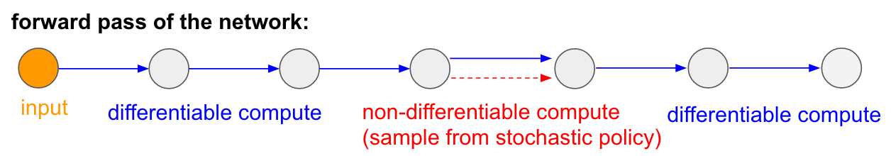 Notice that most arrows (in blue) are differentiable as normal, but some of the representation transformations could optionally also include a non-differentiable sampling operation (in red). We can backprop through the blue arrows just fine, but the red arrow represents a dependency that we cannot backprop through.
