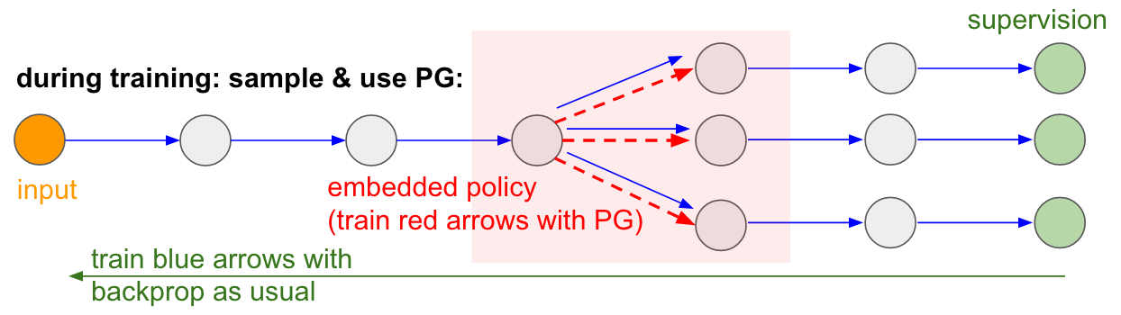 Policy gradients to the rescue! We’ll think about the part of the network that does the sampling as a small stochastic policy embedded in the wider network. Therefore, during training we will produce several samples (indicated by the branches below), and then we’ll encourage samples that eventually led to good outcomes (in this case for example measured by the loss at the end). In other words we will train the parameters involved in the blue arrows with backprop as usual, but the parameters involved with the red arrow will now be updated independently of the backward pass using policy gradients, encouraging samples that led to low loss. This idea was also recently formalized nicely in Gradient Estimation Using Stochastic Computation Graphs.