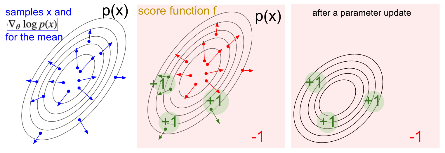 \[\begin{align} \nabla_{\theta} E_x[f(x)] &= \nabla_{\theta} \sum_x p(x) f(x) & \text{definition of expectation} \\ & = \sum_x \nabla_{\theta} p(x) f(x) & \text{swap sum and gradient} \\ & = \sum_x p(x) \frac{\nabla_{\theta} p(x)}{p(x)} f(x) & \text{both multiply and divide by } p(x) \\ & = \sum_x p(x) \nabla_{\theta} \log p(x) f(x) & \text{use the fact that } \nabla_{\theta} \log(z) = \frac{1}{z} \nabla_{\theta} z \\ & = E_x[f(x) \nabla_{\theta} \log p(x) ] & \text{definition of expectation} \end{align}\]To put this in English, we have some distribution \(p(x;\theta)\) (I used shorthand \(p(x)\) to reduce clutter) that we can sample from (e.g. this could be a gaussian). For each sample we can also evaluate the score function \(f\) which takes the sample and gives us some scalar-valued score. This equation is telling us how we should shift the distribution (through its parameters \(\theta\)) if we wanted its samples to achieve higher scores, as judged by \(f\). In particular, it says that look: draw some samples \(x\), evaluate their scores \(f(x)\), and for each \(x\) also evaluate the second term \( \nabla_{\theta} \log p(x;\theta) \). What is this second term? It’s a vector - the gradient that’s giving us the direction in the parameter space that would lead to increase of the probability assigned to an \(x\). In other words if we were to nudge \(\theta\) in the direction of \( \nabla_{\theta} \log p(x;\theta) \) we would see the new probability assigned to some \(x\) slightly increase. If you look back at the formula, it’s telling us that we should take this direction and multiply onto it the scalar-valued score \(f(x)\). This will make it so that samples that have a higher score will “tug” on the probability density stronger than the samples that have lower score, so if we were to do an update based on several samples from \(p\) the probability density would shift around in the direction of higher scores, making highly-scoring samples more likely.