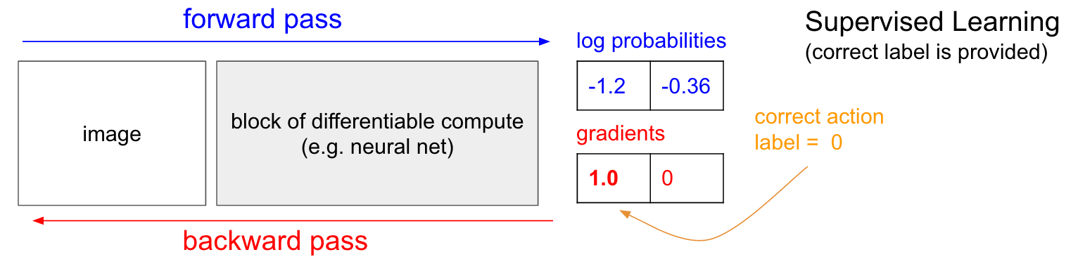 Supervised Learning. Before we dive into the Policy Gradients solution I’d like to remind you briefly about supervised learning because, as we’ll see, RL is very similar. Refer to the diagram below. In ordinary supervised learning we would feed an image to the network and get some probabilities, e.g. for two classes UP and DOWN. I’m showing log probabilities (-1.2, -0.36) for UP and DOWN instead of the raw probabilities (30% and 70% in this case) because we always optimize the log probability of the correct label (this makes math nicer, and is equivalent to optimizing the raw probability because log is monotonic). Now, in supervised learning we would have access to a label. For example, we might be told that the correct thing to do right now is to go UP (label 0). In an implementation we would enter gradient of 1.0 on the log probability of UP and run backprop to compute the gradient vector \(\nabla_{W} \log p(y=UP \mid x) \). This gradient would tell us how we should change every one of our million parameters to make the network slightly more likely to predict UP. For example, one of the million parameters in the network might have a gradient of -2.1, which means that if we were to increase that parameter by a small positive amount (e.g. 0.001), the log probability of UP would decrease by 2.1 * 0.001 (decrease due to the negative sign). If we then did a parameter update then, yay, our network would now be slightly more likely to predict UP when it sees a very similar image in the future.