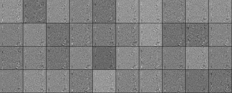 Learned weights. We can also take a look at the learned weights. Due to preprocessing every one of our inputs is an 80x80 difference image (current frame minus last frame). We can now take every row of W1, stretch them out to 80x80 and visualize. Below is a collection of 40 (out of 200) neurons in a grid. White pixels are positive weights and black pixels are negative weights. Notice that several neurons are tuned to particular traces of bouncing ball, encoded with alternating black and white along the line. The ball can only be at a single spot, so these neurons are multitasking and will “fire” for multiple locations of the ball along that line. The alternating black and white is interesting because as the ball travels along the trace, the neuron’s activity will fluctuate as a sine wave and due to the ReLU it would “fire” at discrete, separated positions along the trace. There’s a bit of noise in the images, which I assume would have been mitigated if I used L2 regularization.